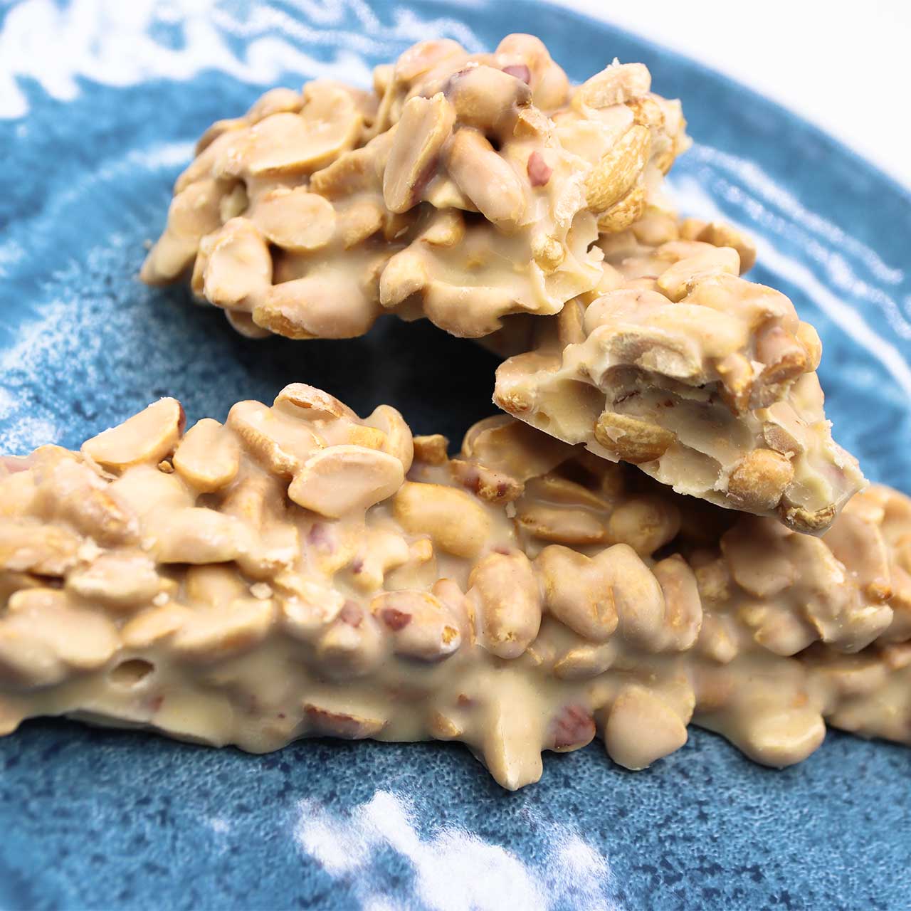 Hochwertiger Erdnussbarren, Weisse Schokolade Kakaoanteil mindestens 30%, mit geschälten Erdnüsse gefüllt und mit feinster Schoklade überzogen.